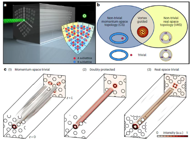 涡旋现象广泛存在于自然界各类系统中,从微观尺度的量子粒子涡旋、活细胞涡旋,到宏观尺度的龙卷风、黑洞等,均呈现出独特的旋转结构与物理特性。在光学领域,携带轨道角动量(OrbitalAngularMomentum,OAM)的涡旋光束,凭借其独特的相位奇异性与模式正交性,为光通信、量子信息处理、高精度传感等领域提供了全新技术路径。然而,涡旋光束在传输过程中的扩散问题、高阶涡旋的分裂现象,长期以来制约着相关技术的产业化应用。近日,南开大学物理科学学院/泰达应用物理研究院陈志刚、许京军教授团队联合克罗地亚萨格勒布大学、加拿大国立科学研究院科研人员,提出基于拓扑旋错的涡旋操控与传输方案,通过双重拓扑保护机制实现了任意阶拓扑荷涡旋的鲁棒传输与目标轨道角动量模式的精准提取。相关研究成果已发表于国际顶级学术期刊《NaturePhotonics》,为新型光子器件的研发开辟了重要方向。