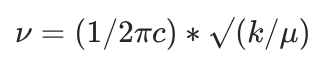 其中ν为振动频率(常用波数cm-1表示),c为光速,k为化学键力常数,代表化学键的强度,μ为成键原子的折合质量。振动频率与力常数正相关,与折合质量负相关,力常数越大、折合质量越小,化学键振动频率越高。