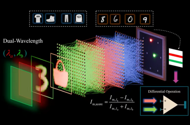 光学计算凭借并行处理、高吞吐量与高能效的固有优势,正引领下一代计算架构的变革,而衍射深度神经网络(D2NN)作为光学计算的核心框架,已在多领域展现应用潜力。针对传统单波长衍射网络空间频率覆盖范围窄、难以捕捉目标多尺度特征的局限,中国工程物理研究院耿远超等研究人员提出双波长差分衍射神经网络(DW-D2NN)。该框架通过协同整合两种波长的互补光学响应,结合端到端深度学习训练,在全光目标分类任务中实现了精度与鲁棒性的双重提升。实验表明,四层DW-D2NN在MNIST和Fashion-MNIST数据集上分类准确率分别达98.7%和90.1%,显著超越传统单波长方案;在含随机散射体的复杂光路中仍保持优异性能,为生物医学分析、工业检测等领域提供了全新技术路径。