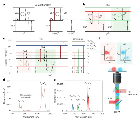 非线性光学因具备高阶非线性特征,在红外探测、频率上转换激光、三维数据存储、光刻微加工及多光子显微镜等领域占据关键地位,而镧系离子依托4f壳层的阶梯状能级结构,成为理想的非线性光子转换材料。其中,基于正反馈离子间能量环的光子雪崩效应,能使镧系离子产生具有超高非线性的上转换发射,是光物理研究与生物光子学应用的重要方向。但传统光子雪崩体系存在固有技术瓶颈,其多由单储层能级维持,不仅导致发射色度难以调制,还存在非线性值小、激发阈值大等问题,严重制约了其在多色亚衍射成像等高端场景的应用。针对这一系列难题,北京大学严纯华院士、孙聆东教授团队联合华南师范大学詹求强教授团队开展系统性研究,首次提出掺钬(Ho³⁺)纳米粒子在室温下的平行光子雪崩机制,成功实现可调谐的多色光子雪崩发射,并将其应用于亚100nm分辨率的多色亚衍射显微成像。相关研究成果发表于国际顶级期刊《NaturePhotonics》,为非线性多色荧光团的制备提供了全新理论与实验范式,也为多色亚衍射成像技术的发展开辟了新路径。
